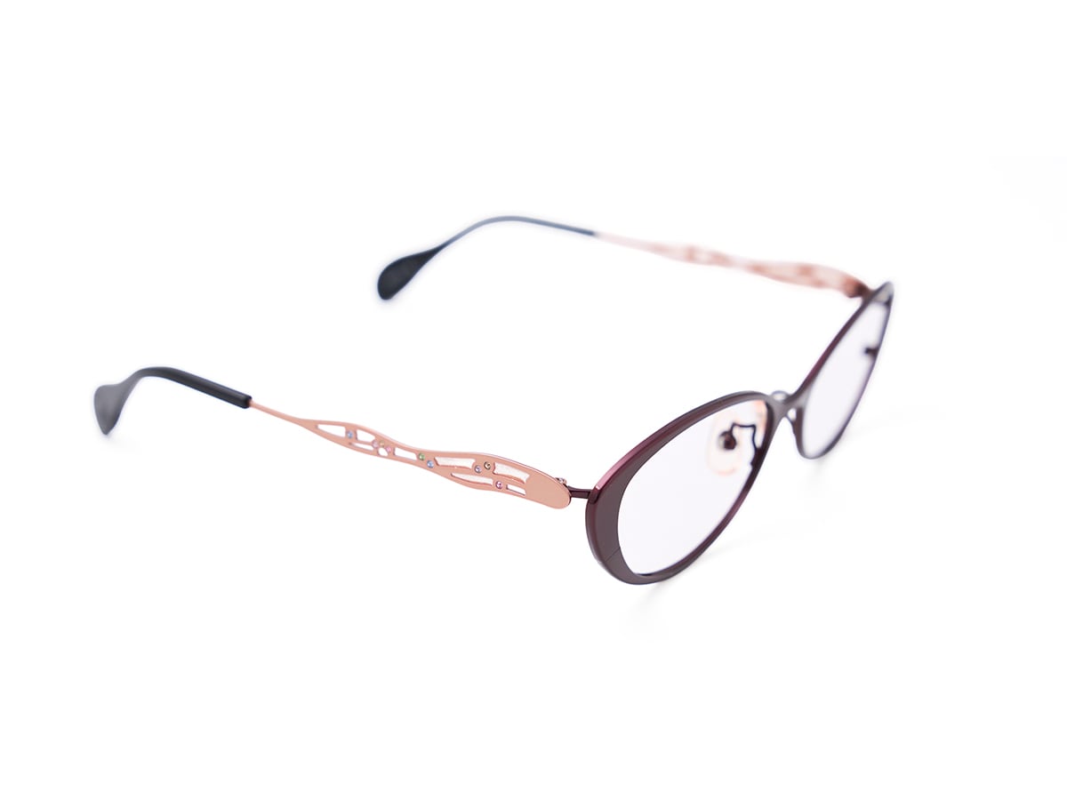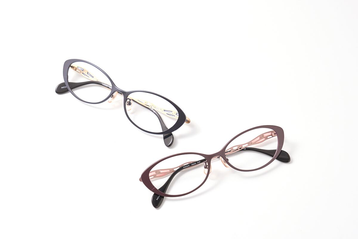 波に揺れる水面から着想を得たモデル。きらきらと乱反射する水の美しさをステンド七宝で表現。波と波の間にスワロフスキーを配置することで動きがある度にきらきらときらめく周りの方の目を引く”褒められメガネ”です。
