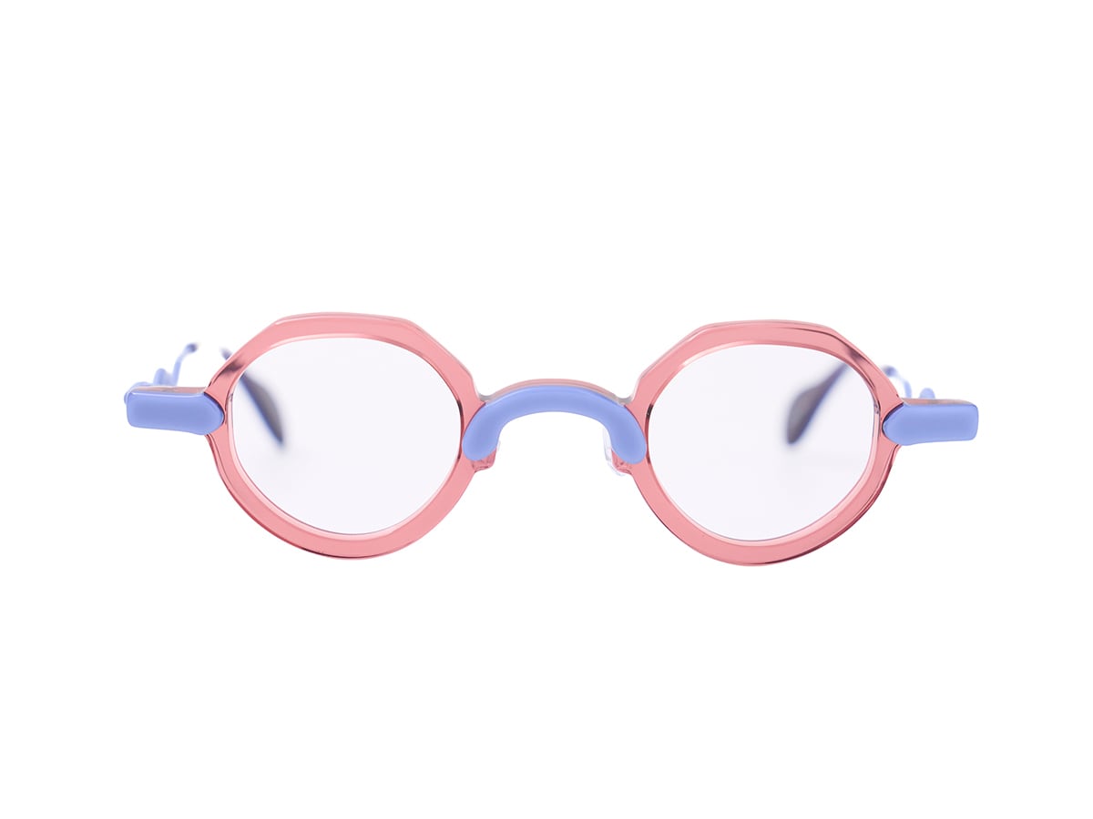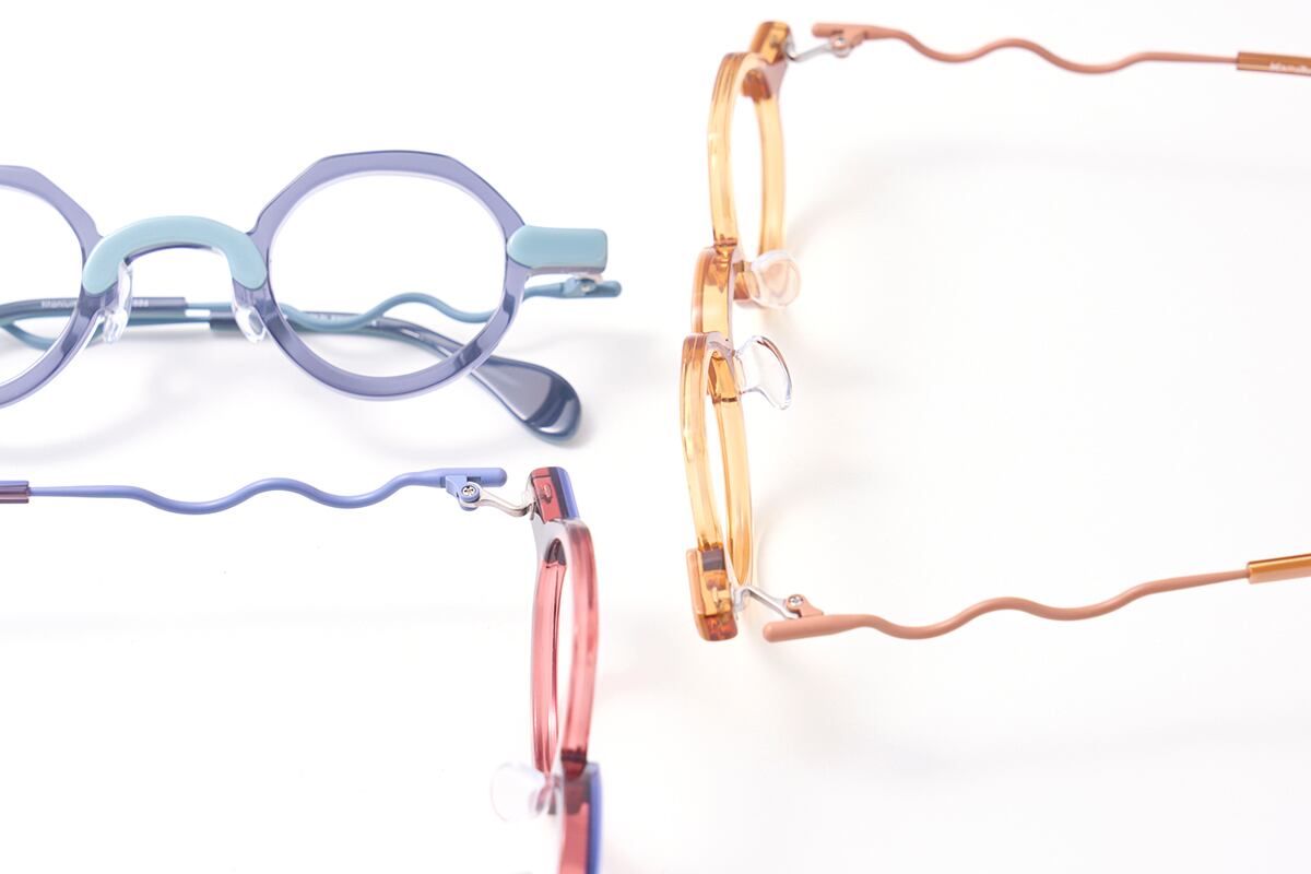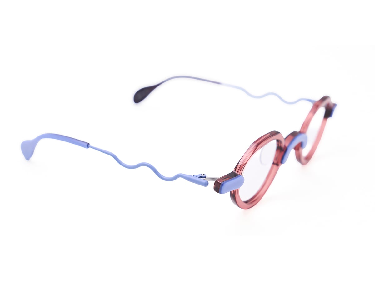 イタリア・マツケリ社のカラフルでPOPな生地を使った小さめのコンビネーションフレーム。テンプルのデザインは縄跳びのたわんでいる様子から着想を得ました。メガネを掛けることは楽しいことというカムロのコンセプトを表現したモデルとなっております。