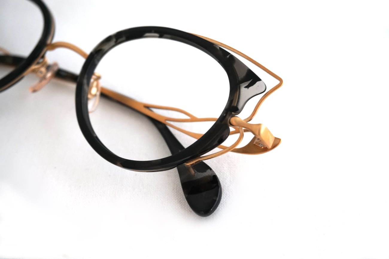 透け感のあるアセテートの生地と金属色の重なりで可愛らしくも新鮮な印象になります。