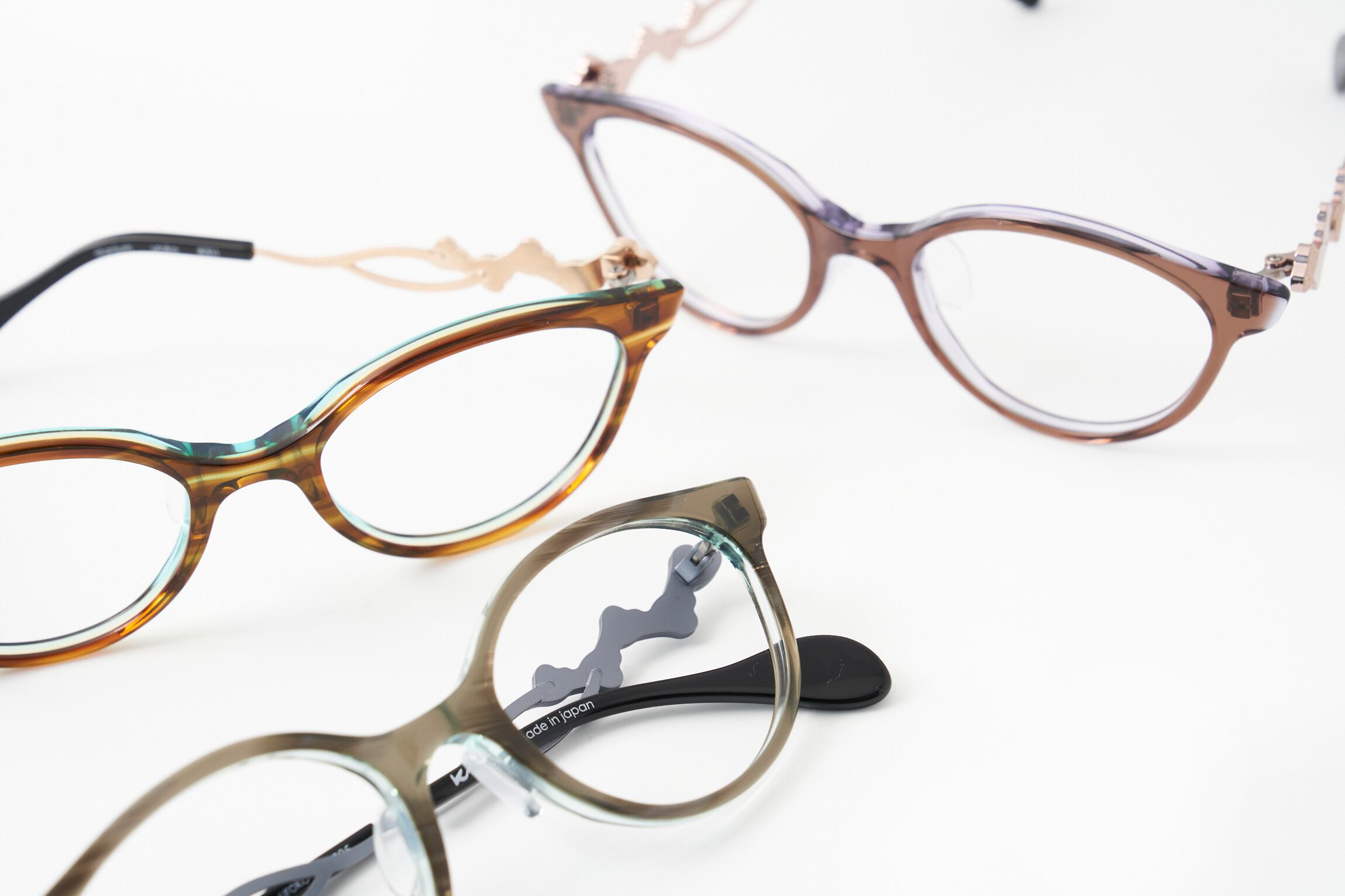 2024SSモデル。 熱帯魚が水の中でキラキラと光る姿をイメージしたKAMUROらしい軽やかなコンビネーションフレーム。 テンプルにあしらったラメは福井県鯖江市の立体印刷技術を用いています。